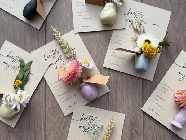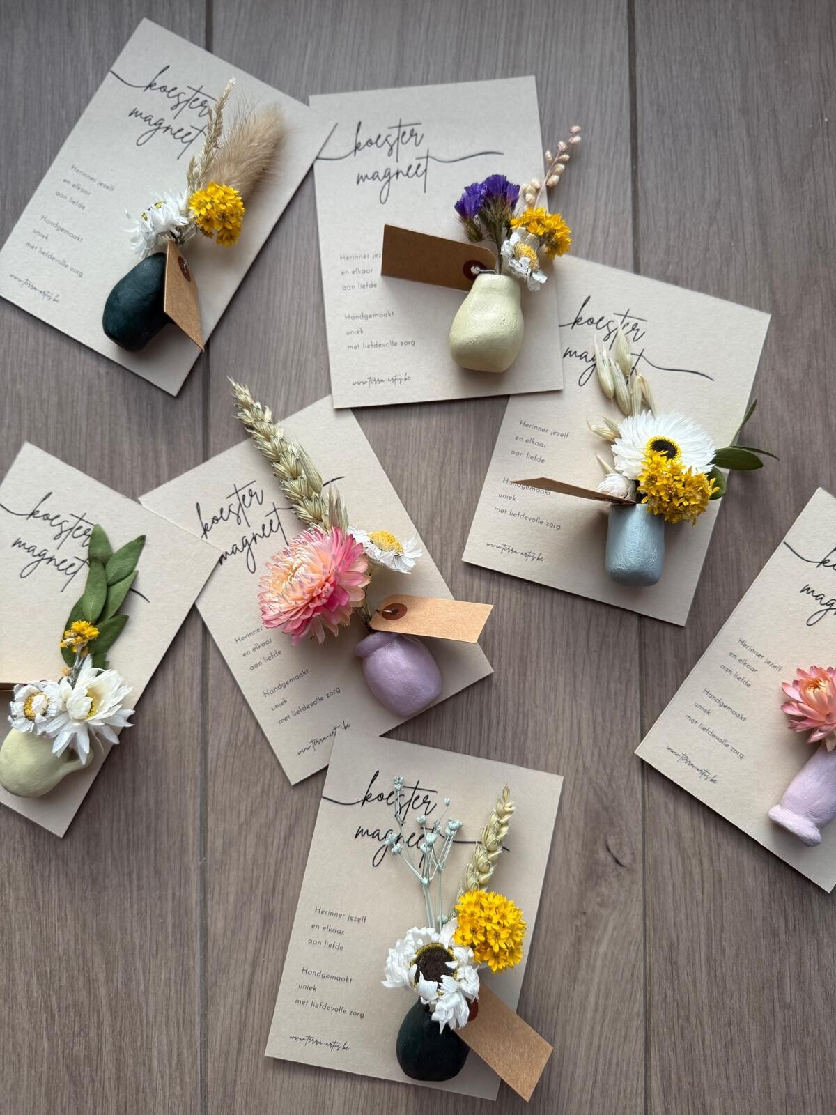 Herinner jezelf en elkaar aan liefde met deze handgemaakte koestermagneten met droogbloemen. Handgemaakt uit klei, met klein label voor een persoonlijke boodschap.