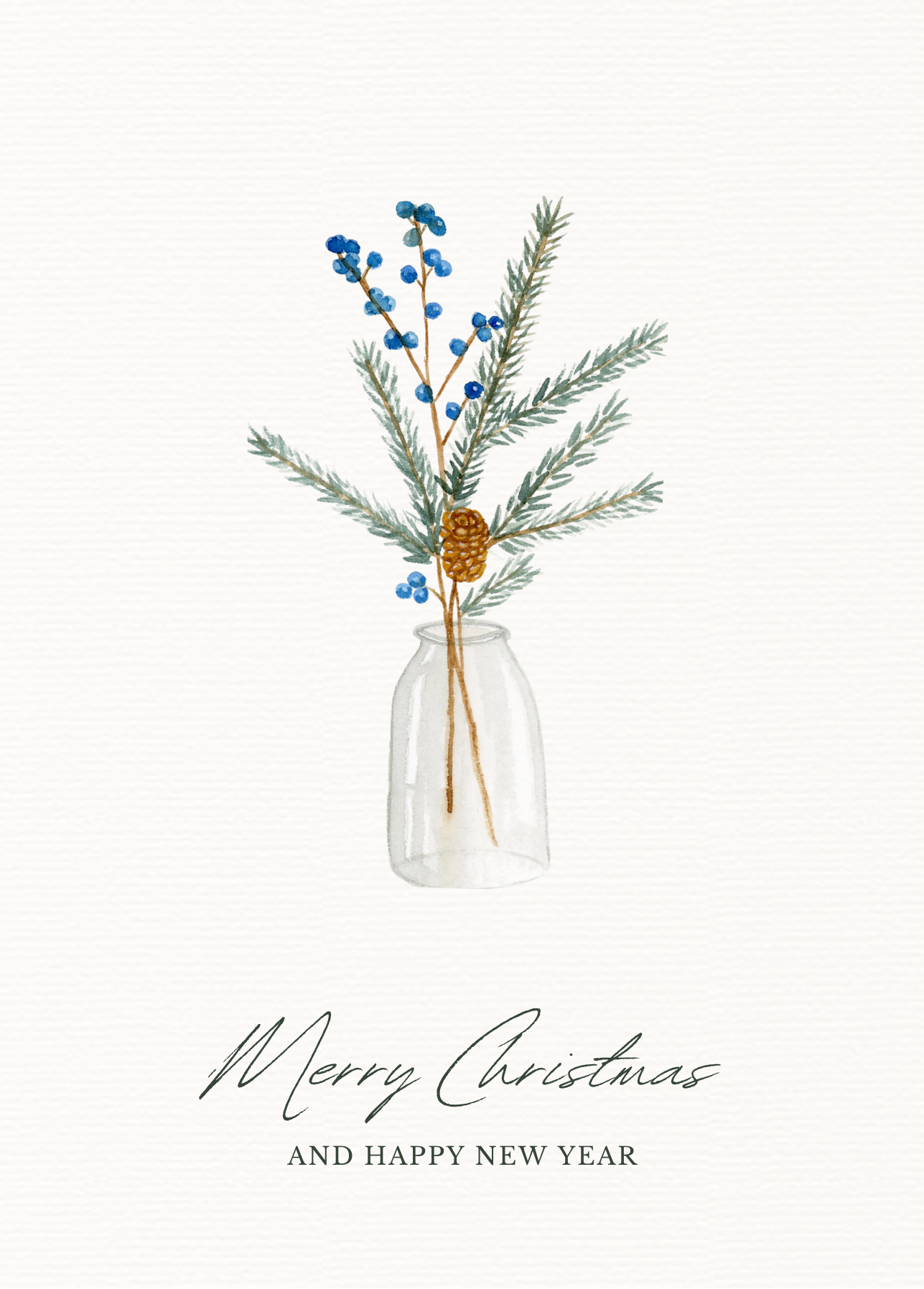 Een liefdevol kerstkaartje met handgeschilderde aquarel illustratie. Verkrijgbaar in drie designs: een dennenboom, wintertakjes in een vaasje of een cadeautje. Perfect om iemand tijdens de feestdagen een warme kerstgroet te sturen.