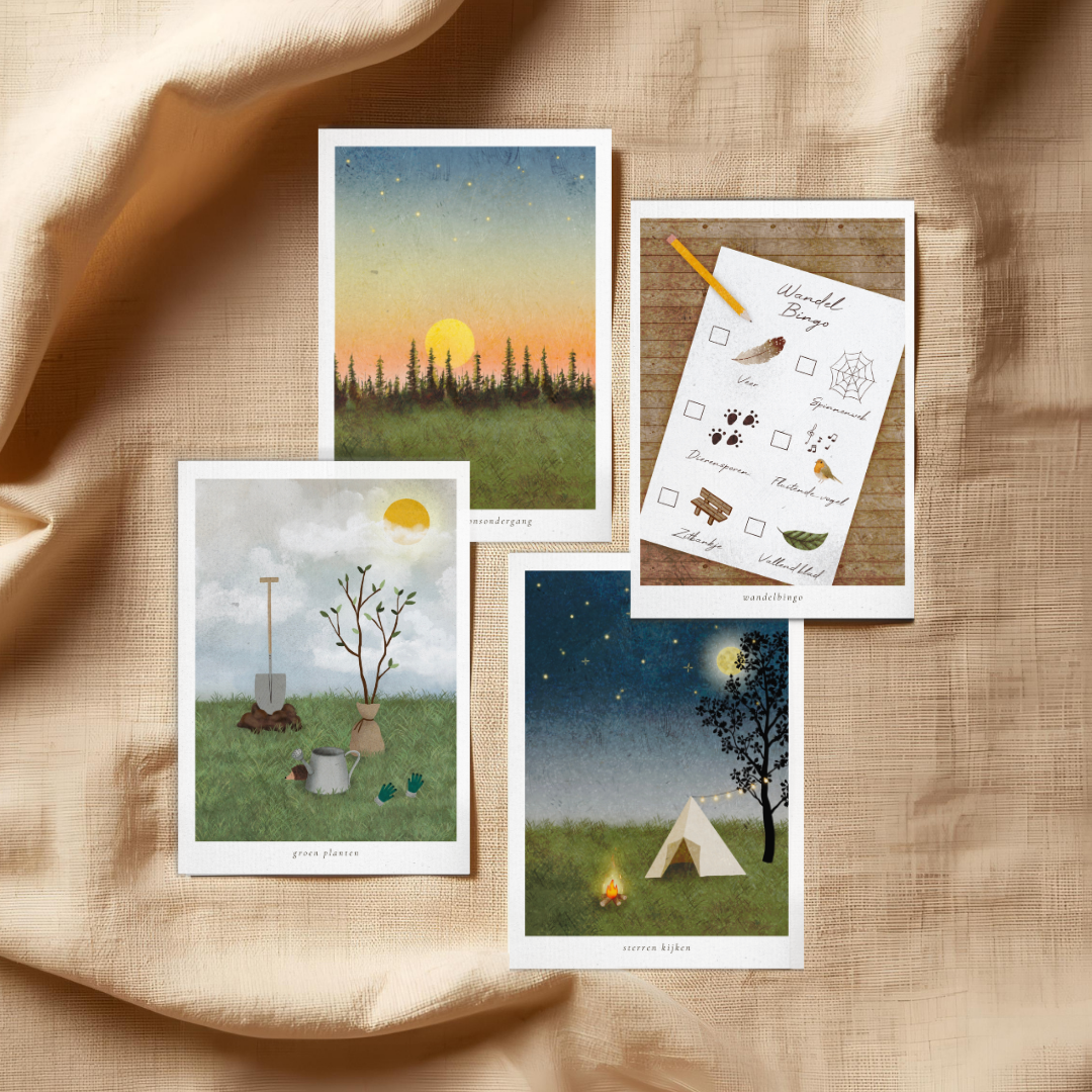 Verpakt in een kartonnen doosje in A5-formaat. De set bevat 8 activiteitenkaarten en 1 kaart met uitleg in A6-formaat, gedrukt op mat gerecycleerd papier van 350g.